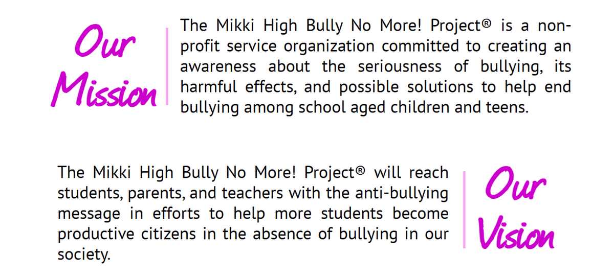 The mission of the Bully No More Project is to raise awareness about the seriousness of bullying and to equip people of all ages with the tools they need to stand against it. The project focuses on prevention, intervention, and empowerment. Through educational outreach, community engagement, and resource development, Bully No More works to create safe environments where individuals can thrive without fear of harassment or intimidation.